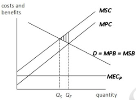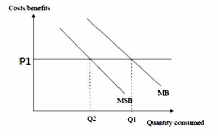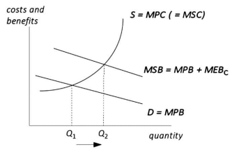 At the free-market output level, $M S B>M S C$ (Option E). The socially optimal output level is where $M S B=M S C$.