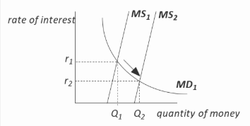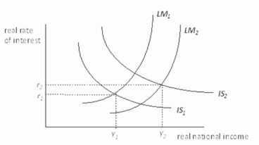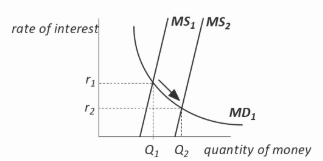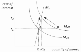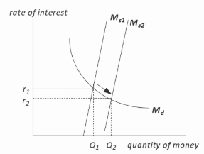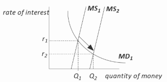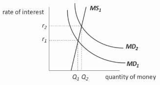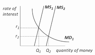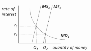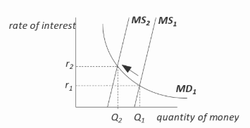 Increasing government expenditure increases aggregate demand and increases national income. The resulting increase in demand for active money increases interest rates if we assume the supply of money curve is fixed. Higher interest rates reduce consumption and investment and possibly net exports, hence crowding out some of the initial increase in aggregate demand. However, increasing the money supply puts an offsetting downward pressure on interest rates so that consumption and investment will not fall.