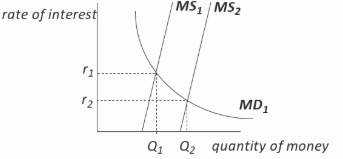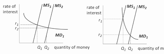 For illustration, consider an increase in the money supply. As shown on the diagram below, this will lead to a decrease in interest rates so that the supply and demand for money can be brought back into equilibrium.The extent to which interest rates will change in response to a change in the money supply depends upon the slope of the money demand curve. If, as in this question, money demand is elastic, ie the demand curve is flattish, then only a relatively small fall in interest rates is required. This means that one of Options A and D must be the correct answer.
