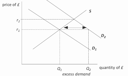 Aggregate demand will decrease if any of its components ( $C, I, G$ or $(X-M)$ ) decrease. A rise in imports will reduce net exports and so reduce aggregate demand. All of the other options cause an increase in aggregate demand: a fall in savings will typically lead to a rise in consumption; a fall in interest rates will make saving unattractive and borrowing (for consumption and investment) more attractive; and a fall in economic and business uncertainty will tend to increase consumption and investment.